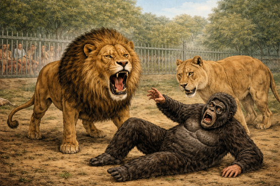 Pat had a look over the lovely field that was the gorilla enclosure; he surveyed the comfortable gorilla house, and tested the bed provided. He agreed to take the job. Very soon Pat had become a great favorite with visitors to the zoo. Being a bit of an extrovert, he would always put on a good act — tumbling, chest-thumping, and growling. But the climax of his performance was most popular. Whenever there was a good crowd, Pat would scale a large oak tree at the side of his enclosure where it adjoined the lion’s pen and pelt the lioness with acorns. The big-maned lion, in particular, would roar with rage and stamp about, and the crowd would roar with delight.